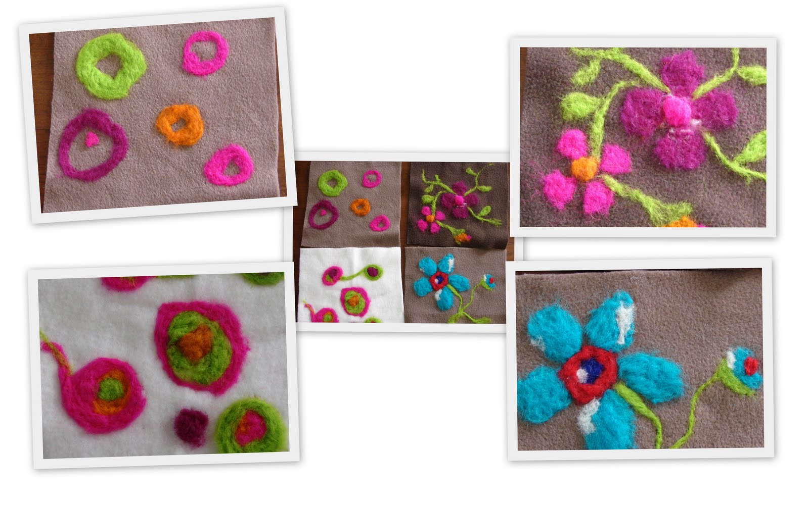Aqui algunas fotos de cosas afieltradas. Están hecha sobre distintas bases (telar, polar, otras telas) y afieltradas con vellón de distintos colores.